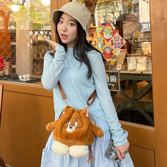 Cat and Mouse Plush Hand-Carrying Bag Cute Personality Drawstring Bag Furry Children's Bags Sweet Girl Storage Small Bag