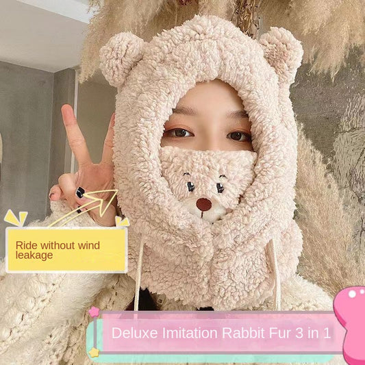 Cute Bear Earflaps Cap Winter Thickened Cycling Thermal and Windproof Winter Autumn and Winter Mask Scarf Scarf Integrated